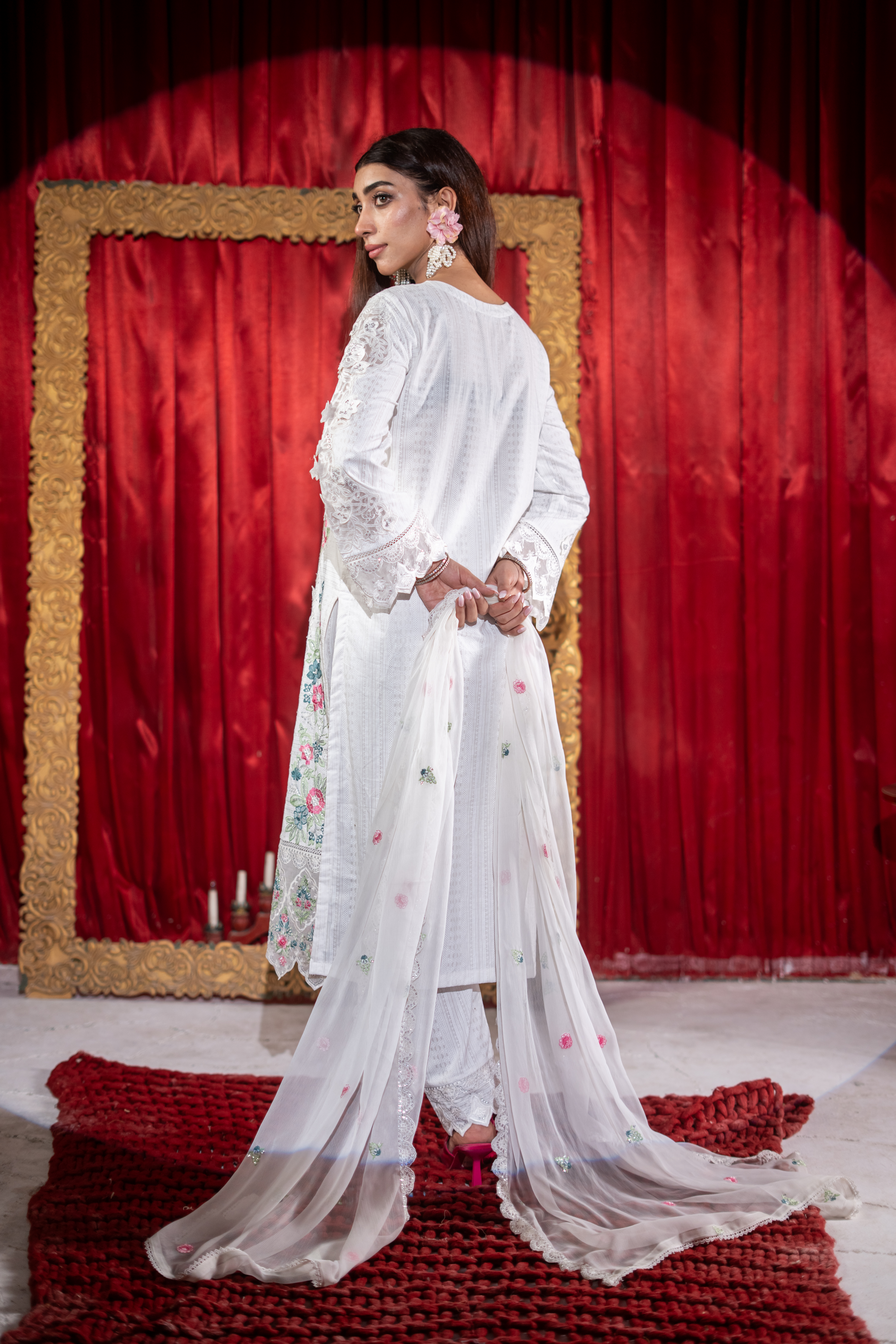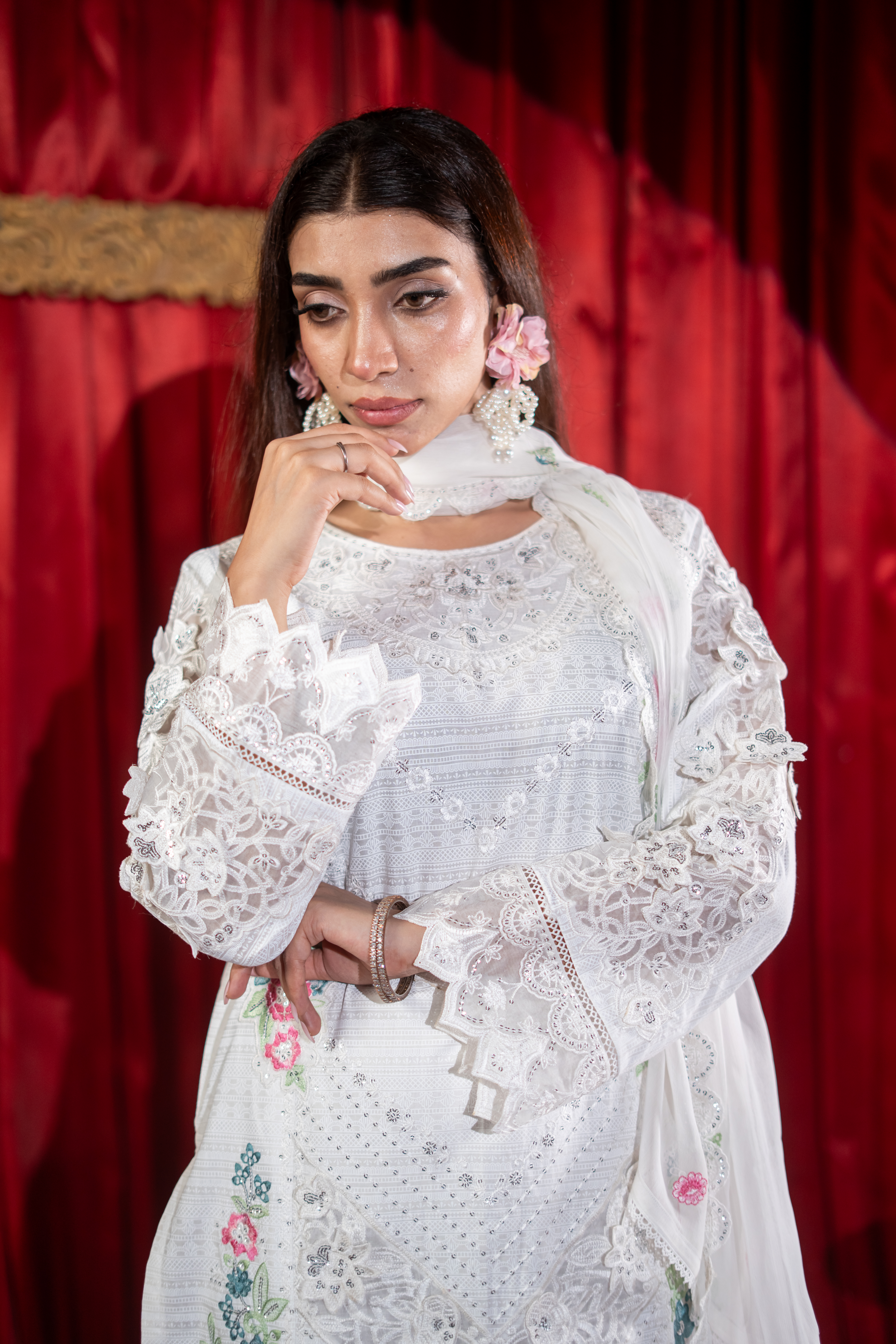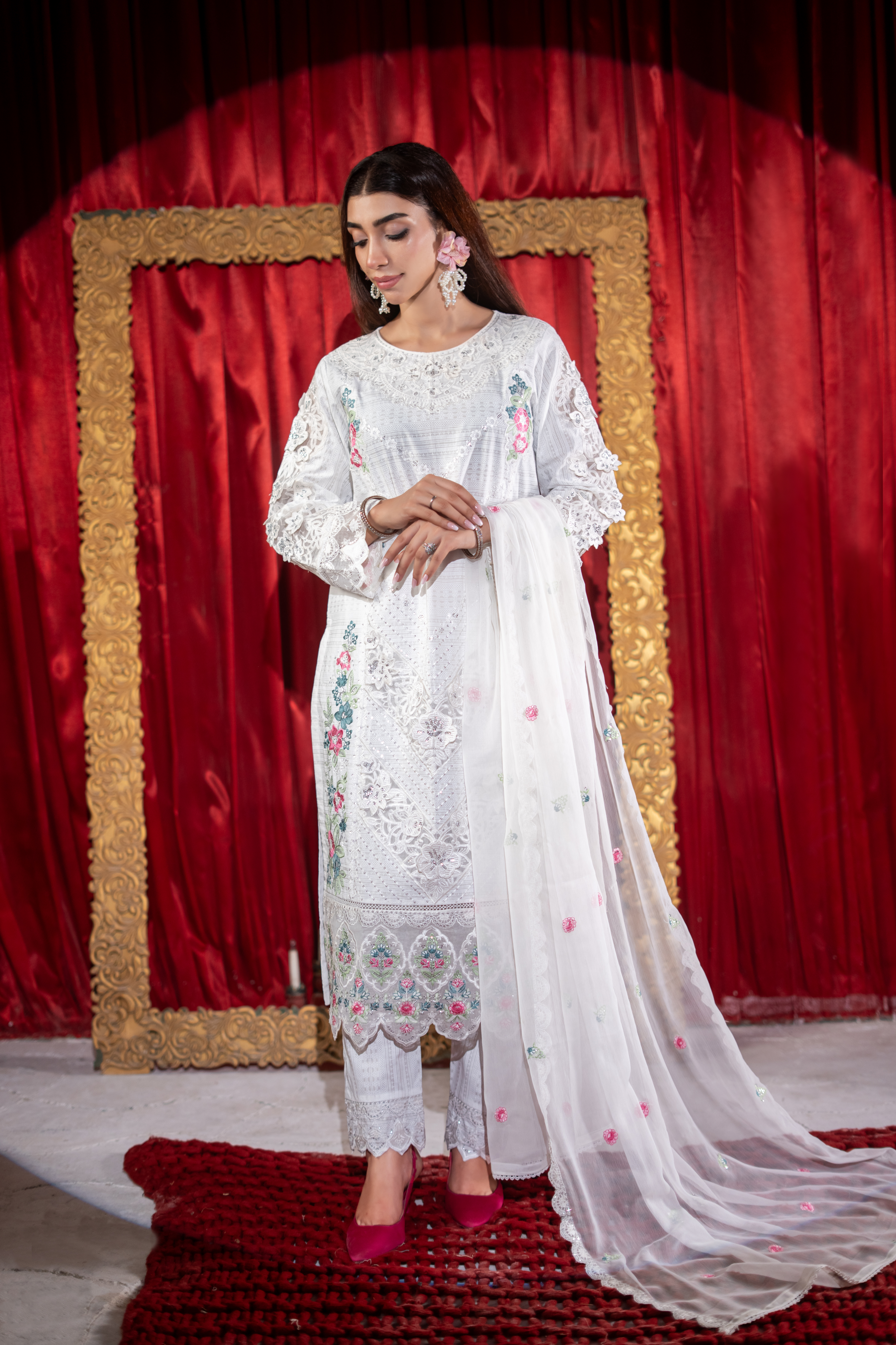 Experience timeless elegance with Shazleen Volume 2 – Porcelain White. Crafted from premium self-textured fabric with 3D embroidery, paired with a chiffon heavy embroidered cutwork dupatta and a self-embroidered trouser. Graceful, luxurious, and effortlessly beautiful.
